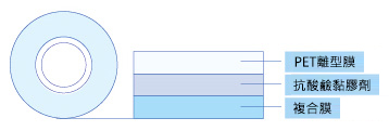 以透明PET膜和PO複合膜為基材,塗佈溶劑型抗酸鹼黏著劑製作而成的保護材料。